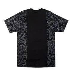 - Black woven fabric with teal and red accents